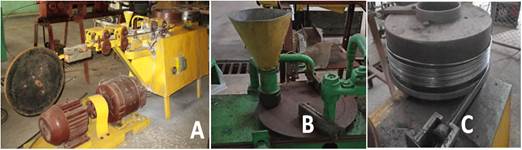 Para la fabricación de los alambres tubulares se utilizó una máquina perteneciente al laboratorio de materiales del Centro de Investigaciones de Soldadura (CIS), la cual se muestra en la Figura 1A. La máquina utiliza la tecnología de fabricación de los alambres tubulares mediante el conformado y trefilado de los metales en frío a partir de una cinta de acero de bajo C (Acero SAE 1010), de 0,5 mm de espesor y 15 mm de ancho. El equipo posee un dosificador (Figura 1B) para la adición regulada de la carga al alambre tubular.
