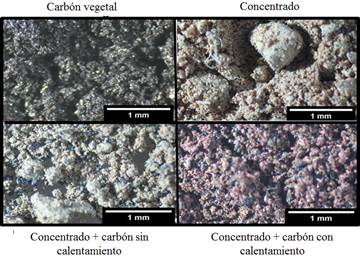 La Figura 2 muestra fotos del carbón vegetal, del concentrado de vanadio obtenido y de la mezcla del concentrado con carbón sin calentar y después de un calentamiento a 450 ºC, donde se aprecia la presencia de partículas oscuras distribuidas dentro del concentrado, lo cual evidencia el grado de mezclado en el producto obtenido.