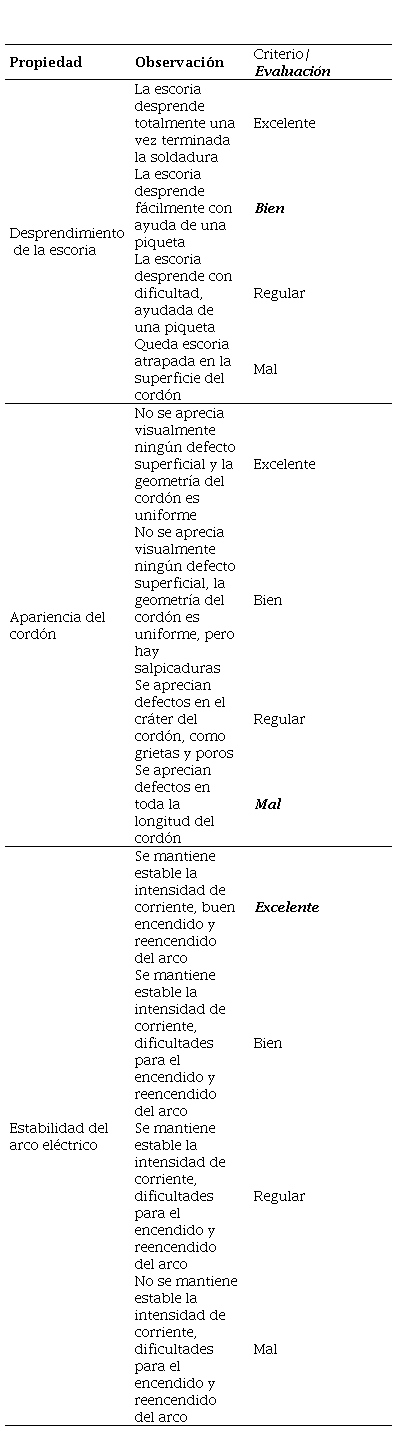 De manera general, las propiedades tecnológicas del electrodo: desprendimiento de la escoria, apariencia del cordón y estabilidad del arco, se comportaron de manera satisfactoria. Un resumen de estas propiedades, durante el proceso de evaluación de los electrodos obtenidos, se muestra en la Tabla 3.
