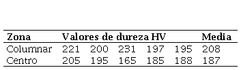 La dureza se determinó en el centro del cordón y en la zona columnar, con un durómetro marca Shimadzu y una carga de 1 000 g.