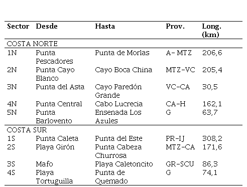 a. Agrupamiento de sectores costeros, como es el caso de Pinar del Río e Isla de la Juventud, así como el sur de Matanzas-Sancti Spíritus y el AJR, que para ello se tuvo en cuenta la similitud de las características de estos tramos costeros, teniendo en cuenta la densidad y dimensiones de los bloques de estas zonas.