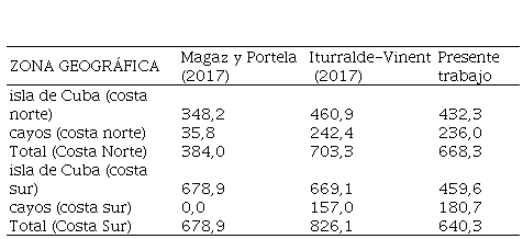 Se realizó la comparación de las longitudes de costas con boulders, las correspondientes al nuevo mapa obtenido con las distribuciones espaciales obtenidas previamente (Iturralde-Vinent, 2017; Magaz y Portela, 2017), visualizándose las diferencias entre los tres resultados (Tabla 3).