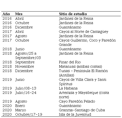 Previamente al 2017 se realizaron tres expediciones científicas (para un total de 18 trabajos de campo, Tabla 1), dos en el archipiélago Jardines de la Reina – AJR (Ciego de Ávila) y una en Guantánamo.