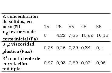Los resultados del estudio de reología indican que el tipo de comportamiento que presentará un sistema puede depender de su rango de concentración. En este caso, la hidromezcla que tienen una baja concentración (15 %), se ajusta a un comportamiento newtoniano, con el valor del esfuerzo de corte inicial igual a cero (ecuación 1). A medida que la concentración de arcilla se incrementa, para valores de 25, 35, 45 y 55 % en peso, la hidromezcla se ajusta a un comportamiento no newtoniano, del tipo plástico ideal (modelo de Bingham, ecuación 3), para los cuales se obtienen valores crecientes de esfuerzo de corte inicial y de la viscosidad plástica. La viscosidad aparente para este tipo de fluidos se deduce combinando la ecuación 1 con la ecuación 3, resultando en la expresión 8: