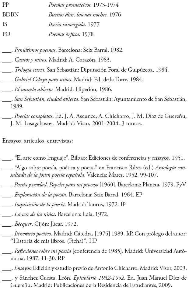 Chicharro Chamorro Antonio. “Los pasos contados (Gabriel Celaya según Gabriel Celaya)”. VV.AA. Gabriel Celaya: premio nacional de las letras españolas, 1986. Barcelona: Anthropos, 1990. 55-84.