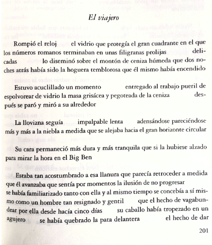 Esa extensión vacía entre el punto y el “Zac” se repite una vez más en el texto. Como si la narración quisiese desbaratar “la ilusión de continuidad” que produce mediante las articulaciones sintagmáticas, la lectura se enfrenta literalmente con manchas blancas que espacian el texto, desmoronando los principios constructivos que podrían haber colaborado en la búsqueda de una coherencia semántica. Ese desvelamiento de sí misma que realiza la narración consiste en una imagen que da a ver la procedencia olvidada de su sentido. El origen de la narración es, precisamente, el blanco en el que virtualmente las posibilidades se extienden al infinito. En el argumento“El viajero” los blancos del texto se presentan desmesuradamente, disolviendo la unidad del cuerpo del texto (201-205).