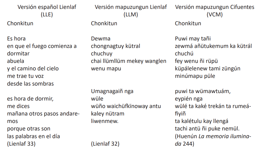 Mientras Cifuentes, por otra parte, traduce "las palabras" con el término nemül (VCM), Lienlaf hace referencia al nütram (LLM), la conversación. “Otra es la conversación del día” (kaley nütram/ liwen mew) plantea el sujeto lírico en mapuzungun y establece así una referencia discursiva concreta, la del nütram mapuche: lo que sucedió en el estado de chonkitun, cercano al fuego y al estado onírico fue un diálogo con el espíritu de su difunta abuela, quien se hace presente en ese momento del día. En este sentido, la retraducción de Cifuentes se limita a una cierta literalidad mientras que la autotraducción de Lienlaf acomete su propia versión en español y acentúa las coordenadas culturales mapuche al retratar una imagen recurrente en su poesía: la del fogón nocturno como espacio receptivo del sueño y la conexión con los ancestros.