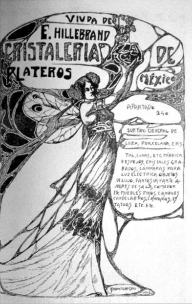 Destaco el hecho de que la valía de esas mercancías pareciera derivarse, justamente, de su tipificación como “artísticas”, cualidad que se enfatiza mediante la inclusión de las firmas de los pintores antes aludidos, cuyos cuadros e ilustraciones se reproducían en la revista, pero que también aparecían en los anuncios publicitarios insertos en las páginas iniciales y finales de cada número. En algunas de esas propagandas de artículos o servicios se emplea el mismo epíteto para promover la venta de productos asociados al lujo y al confort, así como a la belleza y la salud físicas. Un ejemplo de ello se encuentra en la composición del anuncio de la Doraduría de C. Pellandini, donde Ruelas tematizó la experiencia de la creación, para promover esa empresa que aseguraba especializarse en la hechura de “vidrieras artísticas”. La yuxtaposición con otros anuncios dedicados a la venta de esa clase de mercancías ampliaría el sentido de ese adjetivo al crear una especie de asociación entre lo artístico, la moda y el “buen tono”, como se aprecia en esta publicidad de la cristalería de la viuda de Hillebrand, ilustrada por Montenegro.