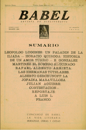 Babel se presentó como Revista de bibliografía a partir de julio de 1923 (n.º 13), e inauguró así su segunda época, luego de algo más de un año de ausencia. Aunque como sección “Bibliografía” solamente apareció en el n.° 14, esta transformación implicó un cambio evidente en la arquitectura de la revista. El pasaje de una época a la otra está ligado con un movimiento de especialización editorial que imantó la revista al sello editor homónimo fundado en 1922 y orientó los focos de exhibición (de lo escrito y los materiales gráficos incorporados) hacia la construcción de figuras literarias e intelectuales ligadas con la edición de libros, dejando de lado las otras prácticas artísticas que ya no tuvieron un espacio propio para su presentación. A la vez, a partir del n.° 14, se redujeron tanto en frecuencia como en extensión las secciones, vinculadas con la configuración, consignación y relato de la dimensión sociable y colectiva de la literatura para enfocarse en la exhibición y mostración del catálogo de la editorial B.A.B.E.L –de los autores y sus obras [33]. En ese sentido, es relevante indicar que las primeras seis entregas de la publicación de esta segunda etapa llevaron en las portadas el grabado de la torre de Babel que singularizaba los libros del sello editor de Glusberg.