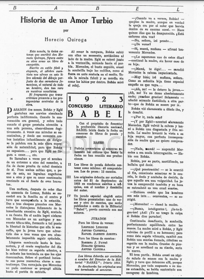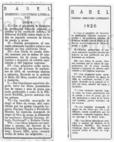 En el n.° 13 que iniciaba la nueva época, un recuadro anunciaba la realización del certamen, cuyas bases volvían a poner el acento en la labor del editor como productor de libros, al convocar a participar solo a autores que “hasta la fecha no hayan reunido sus producciones” [37], es decir, que no hubieran publicado libros. Los nombres de los jurados, todos ellos autores de B.A.B.E.L [38] prestigiaban el concurso: para la poesía Leopoldo Lugones, Arturo Capdevila y Rafael A. Arrieta; para el cuento Horacio Quiroga, Roberto Payró y Arturo Cancela.