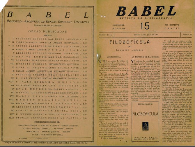 Desde una mirada que atiende a las formas de difusión de la literatura, el análisis de la revista Babel de Samuel Glusberg permite leer la emergencia de un género de publicación particular que es inescindible del surgimiento de la figura del editor moderno, proceso que en Argentina tiene en la década del veinte del pasado siglo. En ese sentido, Babel puede pensarse en el conjunto más amplio de las publicaciones fundadas por esos mismos años por otros editores porteños que empiezan a distinguirse de las revistas literarias. Desde esa perspectiva, Babel puede ser considerada un producto editorial novedoso aunque muchos de los textos que difunde no lo sean o pertenezcan a figuras ampliamente consagradas de la literatura argentina, americana o extranjera. Revisar la colección completa de Babel atendiendo a su dimensión compositiva permite pensar las singularidades de cada una de sus épocas legibles en la arquitectura de sus secciones. El pasaje de la primera a la segunda época muestra una serie de estrategias en las formas de promover, difundir y exhibir los libros y los autores que aproximan la publicación a un catálogo e indican un movimiento de especialización editorial.