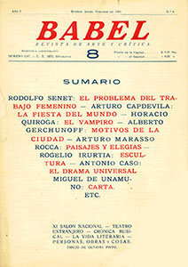 Al igual que las publicaciones europeas y argentinas mencionadas, Babel no se definió como un órgano de una tendencia estética sino como un producto del trabajo “de hombres jóvenes y libres que nos decidimos a editar[la]” [17] y, desde la primera entrega de abril de 1921, declaró su interés por el público y por la prensa, a los que en un brevísimo texto de apertura se dirigió específicamente. Al mismo tiempo, esas líneas inaugurales manifestaron la “creencia en la necesidad de negar un programa” señalando como campo de su intervención la “vida periodística”, forma de mediatización eficaz de la vida literaria [18].