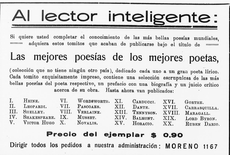 Es interesante destacar la conexión entre el contenido de estas secciones y los avisos de las últimas páginas de Babel. Un caso sintomático de esa conexión se observa entre el comentario sobre la iniciativa de las Bibliotecas al Aire Libre (n.° 5) –promovidas por la Biblioteca Obrera de Buenos Aires e inspirada en experiencias europeas– y los anuncios de ciertas colecciones locales y extranjeras. De este modo, cuando Babel se manifestó a favor de esa propuesta de lecturas al aire libre, indicando que la poesía era el género adecuado para parques y plazas [27], en sus páginas finales dedicadas a la publicidad incluía un aviso de media página que llamaba al “lector inteligente” a adquirir la colección de “Las mejores poesías de los mejores poetas” del mundo cuyos “tomitos” contenían un prefacio con una biografía sobre el autor y un juicio crítico sobre la obra y que podía conseguir en la Administración de Babel.