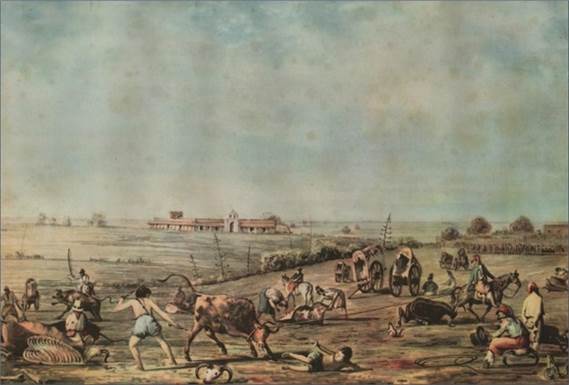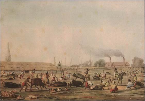 Uno de los aspectos recurrentes en la tradición rioplatense de representaciones visuales y verbales del espacio de los mataderos es la conjunción de hacinamiento y ruido. Basta recordar, por ejemplo, los mataderos que imaginó el ingeniero y pintor saboyano nacionalizado argentino Carlos Enrique Pellegrini (1800-1875) y plasmó en unas célebres acuarelas compuestas a partir de una estética del caos (figuras 1 y 2). En estas y otras estampas semejantes del periodo, como las del inglés Emeric Essex Vidal o el suizo Hipólito Bacle, la concurrencia de elementos —carniceros, pialadores, enlazadores, mirones, achuradoras, reses vivas y muertas, carretas, vísceras, costillares descarnados, cráneos con cornamenta— genera un cuidado ruido visual que hace de correlato de la algarabía y la bulla que ya narraba Alonso Carrió de la Vandera en el Lazarillo de ciegos caminantes (1773).