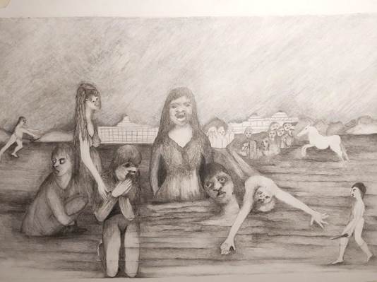 En esta línea de reescrituras, debemos ubicar la edición ilustrada más reciente de El matadero, de Esteban Echeverría, publicada en agosto de 2020 en la editorial artesanal Charco. La ilustradora es la escritora, diseñadora y pintora porteña Silvina Pachelo, que cuenta en su haber libros ilustrados de La tempestad, de William Shakespeare y la Medea de Esquilo, obras fundamentales de la cultura occidental a las cuales se aproxima con una mirada feminista y decolonial. En su trabajo sobre El matadero, compuesto de diez ilustraciones, Pachelo se desentiende de la bruta gauchada, cuyo exceso de testosterona es siempre una promesa de violencia: “En mis ilustraciones hay más mujeres que hombres. Ya El matadero referencia a lo masculino; la obra es de machos, machos que matan, que se matan entre ellos, y el final muestra un acto de humillación brutal, una violación homosexual” (Pachelo s/p). Como se advierte, la ilustradora parte de la concepción de El matadero como una obra acerca de las masculinidades nocivas y sobre esa base erige su lectura, deliberada y furibundamente contestataria. Las ilustraciones que derivan de esa lectura, como veremos en los siguientes apartados, pretenden ofrendarles un espacio de visibilización a los sujetos femeninos marginados por el texto de Echeverría —que además son negras o mulatas—, al tiempo que parecen apuntar al estado endémico de violencia contra la mujer que se experimenta en Latinoamérica y que, sobre todo en los últimos diez años, ha sido expuesta en la literatura mediante diversas formalizaciones estéticas.