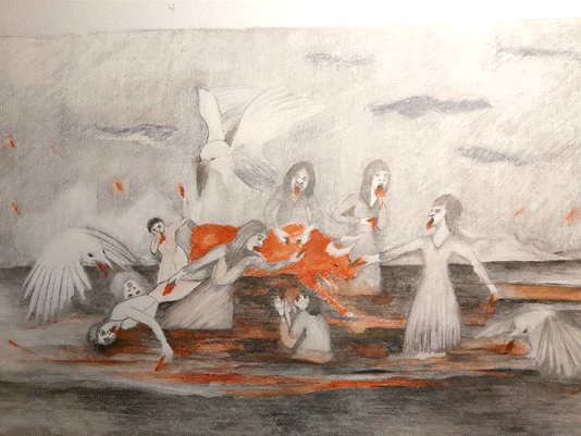 En la fuente literaria, dichas consecuencias están relegadas casi hasta la invisibilización. En su afán de ganar la batalla dialéctica contra el bando político enemigo, al narrador de El matadero solo le importa el cuerpo maltratado del unitario, acaso una proyección en la diégesis del propio Echeverría. Sin embargo, la obra sugiere que la violencia que se gesta y acumula por la propia dinámica de los corrales puede desbordarse en cualquier momento y en cualquier dirección. Las propias negras y mulatas achuradoras, las únicas mujeres que son parte constitutiva del espacio, son objeto de amenazas: “¡Che!, negra bruja, salí de aquí antes de que te pegue un tajo” (101), le dice a una de ellas un carnicero. De esta clase de sugerencias parte Silvina Pachelo para reformular plásticamente la violencia federal, lo que implica re-politizarla y, así, actualizarla. Esta forma de ilustrar El matadero no es nueva ni mucho menos. De hecho, la que podría ser la primera interpretación visual del texto, la cual corrió a cargo del pintor Emilio Más, data de 1934 y se aloja en las páginas de la revista argentina filoanarquistaNervio, ya le da la espalda a la estética visual gauchesca con la intención de centrarse en el sedimento político de la obra echeverriana y establecer, de esta manera, continuidades entre Juan Manuel de Rosas y José Félix Uriburu, quien había llegado al poder en 1930 mediante golpe de Estado. La revista Nervio, pues, inaugura una corriente de interpretación plástica de El matadero caracterizada por priorizar y actualizar la raíz política de la obra de Echeverría, por deslindarse total o parcialmente de la enciclopedia icónica gauchesca y por colocar en primer plano la violencia. A esta corriente después se sumarán pintores de la estatura de Carlos Alonso, en 1963 y Marcia Schvartz, en 2011, por mencionar dos de los ilustradores de El matadero de mayor relumbre y, también, lo hace la propia Silvina Pachelo.
