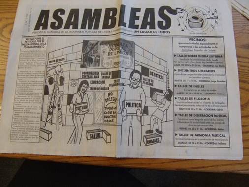 Al repasar una de las colecciones del archivo sobre la crisis sociopolítica en Argentina al comienzo de los años 2000, empecé a notar repetidas referencias a bibliotecas populares y donaciones de libros para barrios. La historia de la crisis argentina de 2001-2002, cuando la economía y el sistema político colapsaron, se cuenta en este archivo a través de afiches, volantes y boletines distribuidos en la calle. Terminé leyendo todos los boletines de las asociaciones barriales, detalladamente reunidos y ordenados en carpetas y descritos en los auxiliares de búsqueda de la catalogación del archivo. Allí descubrí los logos de cada asociación barrial y pude apreciar la gráfica de sus tapas. Los símbolos de la cacerola y el piquete, de los bancos cerrados y abandonados convertidos en centros barriales que representan el trabajo colectivo hacia una forma de participación política directa y horizontal experimentado en las calles. Este es solo el ejemplo de un contexto entre miles que este archivo ilumina. Como muchos de estos materiales tenían en las calles urbanas su destino (volantes, panfletos, afiches) –incluso se encuentran materiales con la huella de un zapato o con números de teléfono escritos a mano– aquellos nos revelan historias callejeras y desde ellas, nosotros como lectores, podemos recomponer los eventos, las marchas, las iniciativas de los ciudadanos comunes.