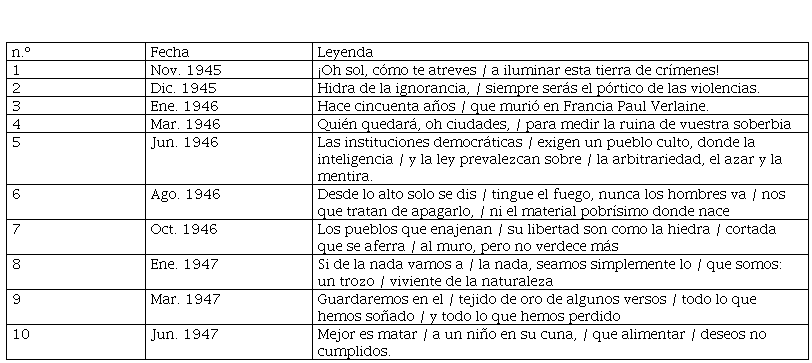 “Quién quedará, oh ciudades, / para medir la ruina de vuestra soberbia”, la leyenda del n.º 4, de marzo de 1946, remite a la imagen de la ruina y constituye un claro ejemplo de ideología cuarentista: la decadencia de las ciudades y la civilización humana se presenta como algo inevitable, en oposición implícita a una naturaleza que perdura; subyace, además, la angustia por la propia permanencia. La generación del 40, como ya se dijo, se preocupó intensamente por la finitud y la fugacidad; consecuencias de esto son la fascinación por la ruina (y el temor de devenir una ruina) y el ansia de encontrar algún tipo de trascendencia, como plantea la leyenda del n.º 9 de marzo de 1947, en la cual el “oro de algunos versos” es capaz de guardar una porción de los sueños de la humanidad, o, al menos, de aquella parte de la humanidad comprendida en el “nosotros” de la revista, un “nosotros” ciertamente elitista.