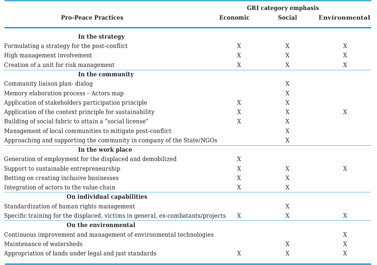 Pro-Peace practices in Colombia have been legitimized when recorded in companies’ Sustainability reports. As a set, these practices may be equated to those identified in the literature (Ford, 2015; Forrer and Katsos, 2015; Oetzel et al., 2010; Oetzel and Getz, 2012) and framed within economic development, building a sense of community, diplomacy, promotion of dialog and risk management; but particularly to those practices associated to the establishment of CSR principles and standards (Table 2). Specifically, the second approach to Pro-Peace practices).