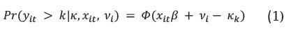 Wherein is the number of subjects for the model, 9 in this case; the Panel’s time period, 10 years in this case; the residue is independent and identically distributed they are a set of cut-off points, where is the number of possible outcomes and finally Φ ( ) is standard cumulative normal distribution function.