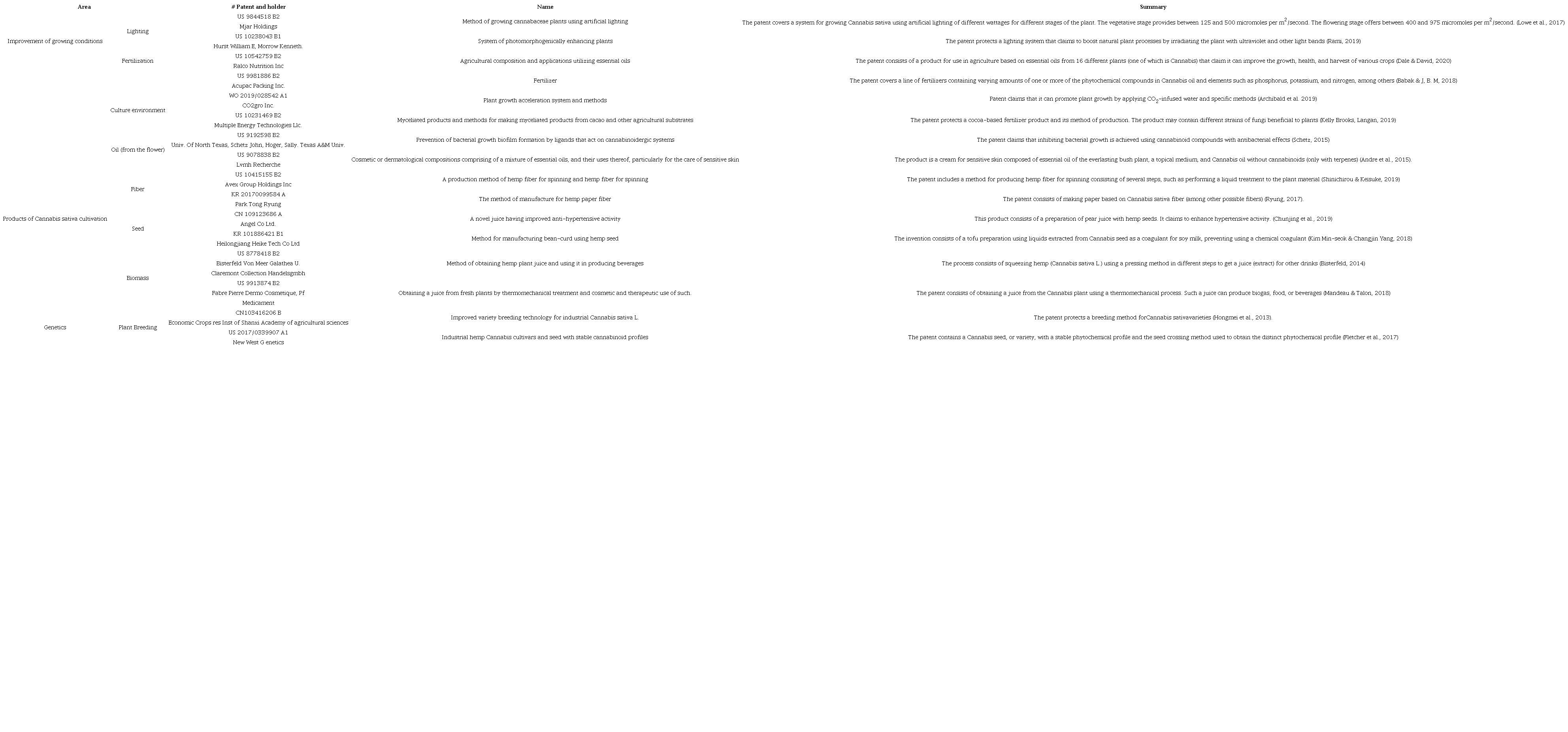 In the first column of Table 1 are the three identified areas in Figure 1. They are associated with aspects delimited to organize the patents in different topics related to horticulture and Cannabis production. These aspects are lighting, fertilization, growing environment, oil, fiber, seed, biomass, and plant breeding. Each was related to some patent documents selected according to the criteria previously indicated.