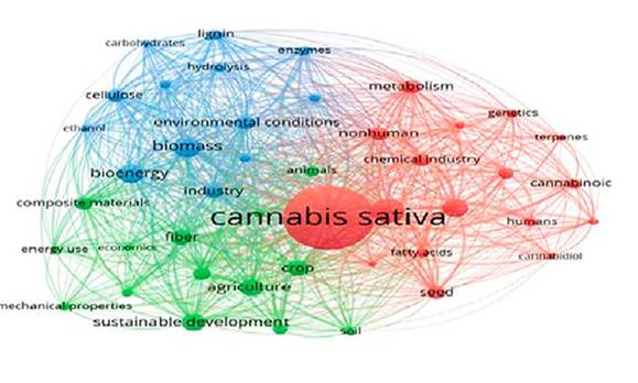 We generated a map from the searched records in the SCOPUS database, that is, Figure 1. It shows the co-occurrence of words in the articles identified. It is possible to identify three clusters of different colors, where there are 44 words distributed and whose central axis is the term Cannabis sativa, interconnected with all the other keywords. The clusters are: