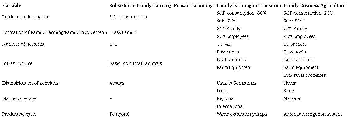 For this research and to profile those economic units that could be considered small rural family businesses, Family Subsistence Farming (Peasant Economy), Family Farming in Transition, and Entrepreneurial Family Farming will be understood as follows (Baldazo-Molotla et al., 2020):