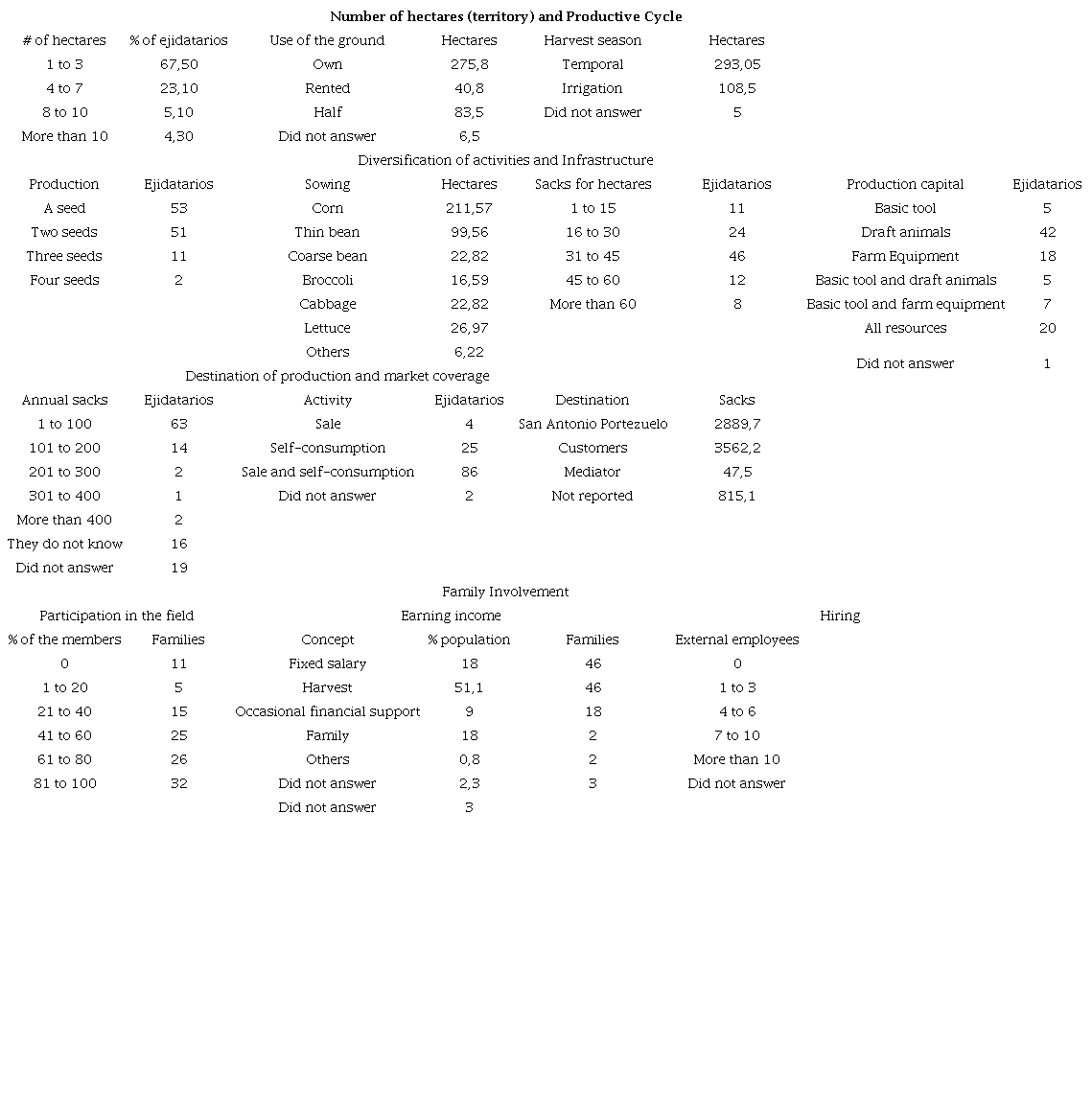 Concerning production and diversification, land allotment per crop type is 211.57 ha (52%) for corn, 99.56 ha (24.5%) for thin beans, 22.82 ha (5.6%) for thick beans, 16.59 ha (4.1%) for broccoli, 22.82 ha (5.6%) for cabbage, 26.97 ha (6.6%) for lettuce and 6.22 ha (1.5%) for other seeds, which some surveys listed as nopal. On the other hand, it is essential to stress the number of seeds that the communal land holders of San Antonio Portezuelo sow on average: out of 117 communal lands holders surveyed, 45.3% (53 communal land holders) sow only one type of seed, 43.6% (51 communal land holders) sow two types of seeds, 9.4% (11 communal land holders) three types and 1.7% (2 communal land holders) do four types.