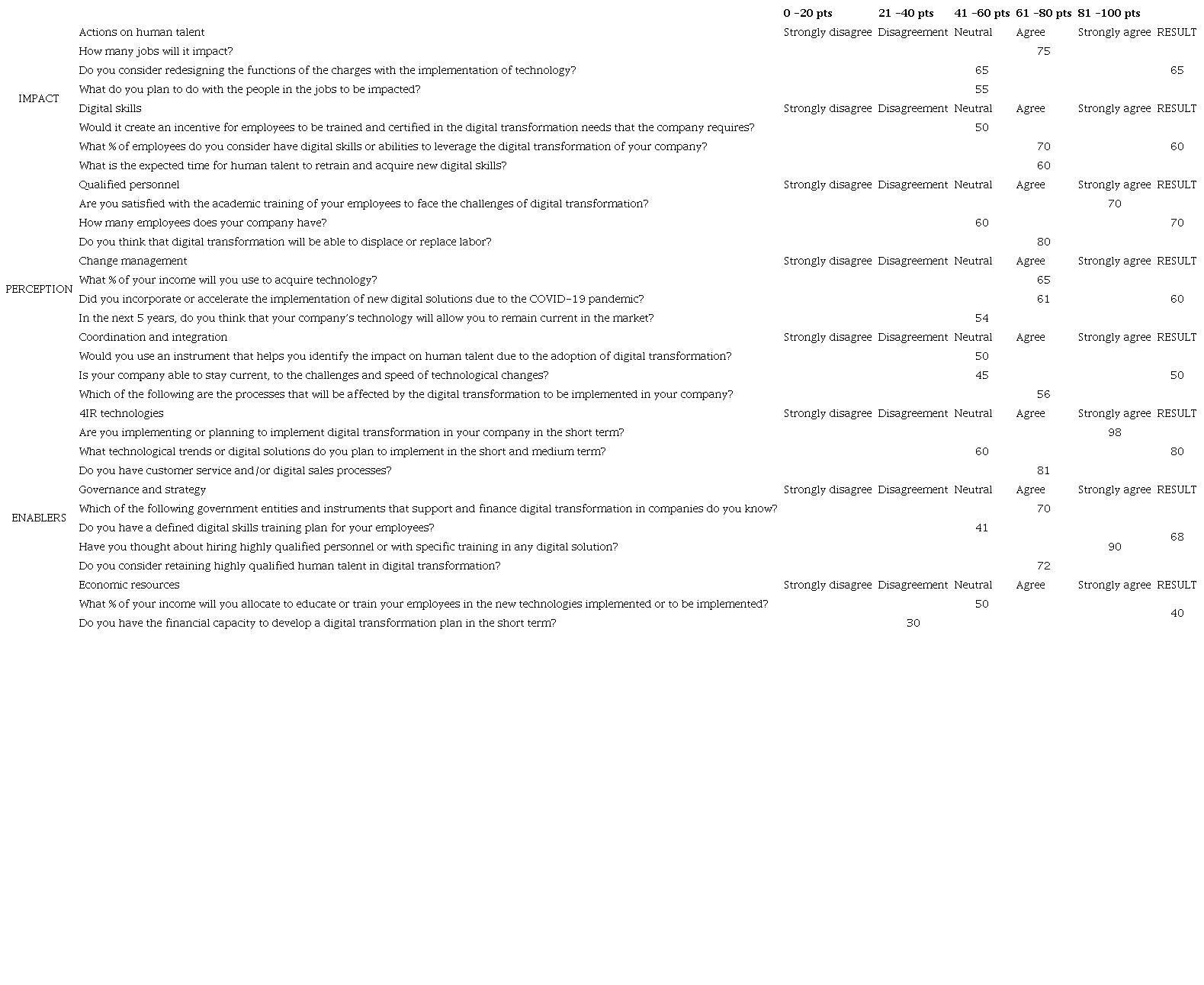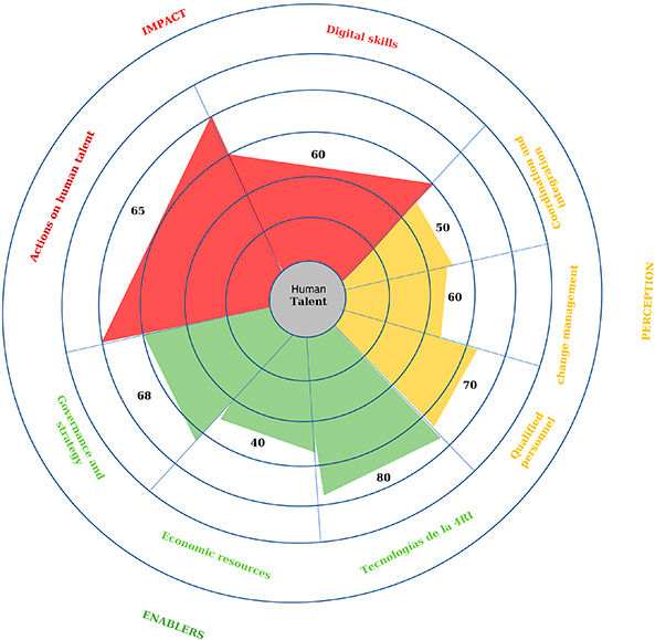 The analysis of results is grouped into three pivotal elements. One is called enablers, which includes factors such as the economic resources of companies, governance and strategy. The second is perception, which considers factors such as coordination and integration, change management, and qualified personnel required to take advantage of technology; finally, impact involves actions on human talent and factors such as digital skills. The results obtained are presented in Figure 2.