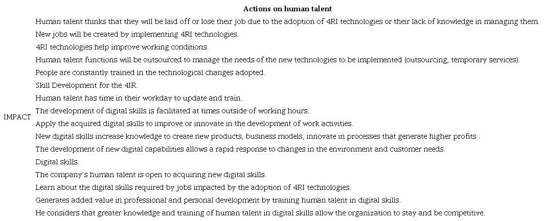From the results obtained, it can be deduced that SMEs will take actions consistent with the realities of technological change due to the 4IR, favoring the training of human talent and adjusting the functions and performance of daily activities to adapt. However, a proportion of employees will be adversely affected.