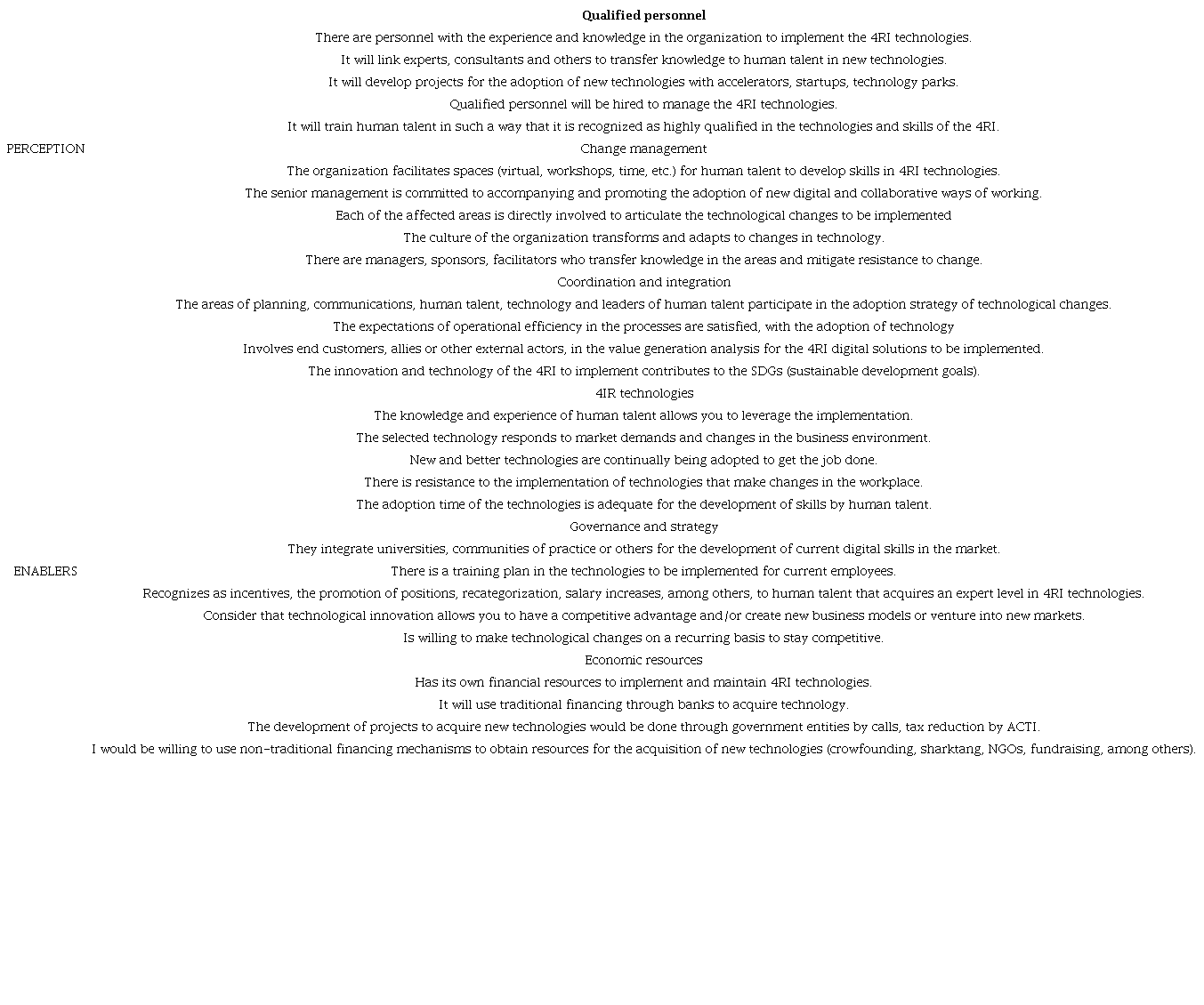 Based on the research results, the following variables are put forward to strengthen and delve into additional aspects for analyzing the impact of technologies on human talent in the context of SMEs in Bogotá, with additional factors that enrich future research. These variables complement the improvement that unifies the grading scheme with the new factors and their unfolding (Table 2). We also propose improving the Perception and Enabling element, adding to the latter the subcategory “Skill Development for the 4IR” and its unfolding (Table 3).