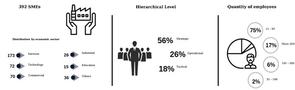 The population under study were SMEs in Bogotá, with 41,062 small-sized and 11,851 medium-sized (Instituto Nacional de Contadores Públicos de Colombia [INCP] (National Institute of Public Accountants of Colombia), 2021). The sample was adjusted to a 95 % confidence level, with a margin of error of 4.931 %. A representative sample of 392 Bogota organizations underwent a structured interview with 24 questions to recognize the factors that impact organizations and their workers when implementing new technologies.