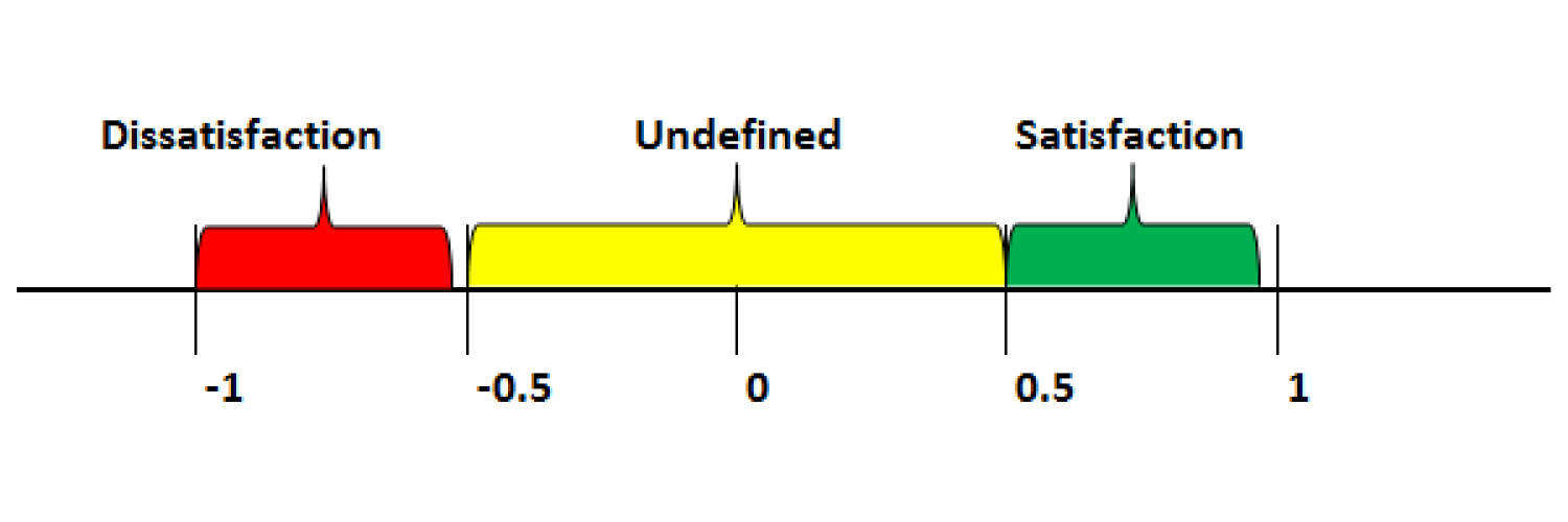 and -0.5 indicated satisfaction; between - 0.49 and + 0.49 showed some contradiction; whereas the values between 0.5 and 1 indicate satisfaction.