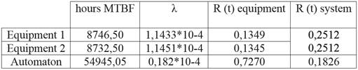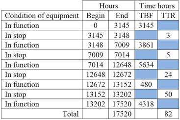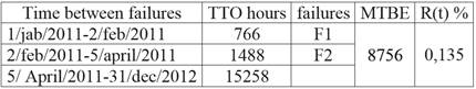 From the data obtained and the analysis, in table 2 the values of equipment reliability and system for a period equivalent to analyzed from the variable mean time between failures (MTBF) period and the failure rate is (λ) corresponding.