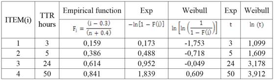 Table 10 shows the values of time between failures and repair time observed for two years taken for the study. These data were the basis for identifying the type of distribution (see table 11) used in the subsequent calculation of the maintainability (Table 12) 9