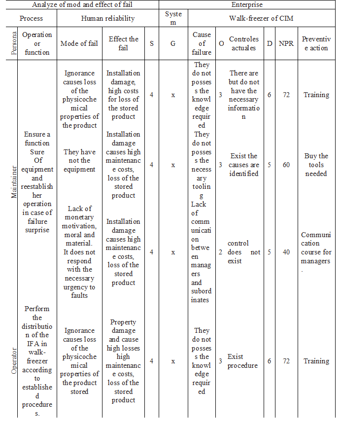Figure 2 shows the interaction of the elements explained aforementioned and their application to technical system studied, it was the walk-freezer used in the manufacture of an intermediate product (IFA) belonging to a production of bio-pharmaceutical products shown. The type of components, quantity, quality and how they are arranged has a direct effect on system reliability.