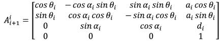 Para modelar la cinemática del Quanser HD2, el dispositivo debe representarse como un sistema robótico paralelo de 6 DOF, tomando el centroide de su efector como su posición final. De acuerdo a la representación geométrica del dispositivo, la cual se detalla en 10, los parámetros de Denavit-Hartenberg se muestran en la tabla 1. Sabiendo que los valores describen el movimiento de la articulación próxima respecto a la anterior y usando A i+1 i , que es la matriz de transformación homogénea observada en la ecuación 1, la posición final del efector respecto a la base del dispositivo se estima por la multiplicación de cada una de sus matrices de transformación, similarmente a la observada en la ecuación 2, donde R es la matriz rotacional y T es el vector posicional.