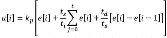 Para solucionar esta problemática, se propuso una matriz de control que trata las señales filtradas recibidas de los dispositivos de control con controladores PID. De acuerdo a 13 un controlador PID en términos de la iteración (i) y su ganancia proporcional (kp) se representa como se ve en la ecuación 10, donde ts es el período de muestreo de las señales, mientras que td y ti son los tiempos derivativo e integral respectivamente.