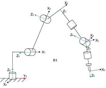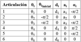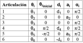 [6]Una vez obtenida la información de los dispositivos de control, es necesario realimentar la posición actual de los manipuladores al módulo maestro del sistema teleoperado. Esta información, recibida desde los controladores de los robots, se encuentra en el dominio articular, de modo que debe ser transformada al dominio cartesiano usando sus modelos de cinemática inversa y directa. Como la diferencia entre ambos robots es solamente la geometría de sus partes, el modelo de los robots se basó en una única representación, como se observa en la figura 2, calculando sus parámetros de Denavit-Hartenberg y mostrándolos en la tabla 2.