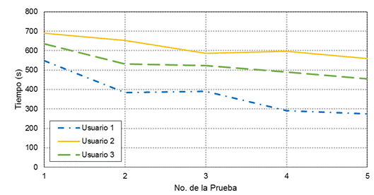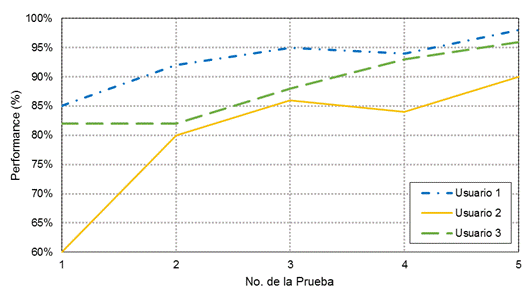 Respecto a la capacidad para ser un banco de enseñanza y entrenamiento en el área de la cirugía médica, los resultados también son óptimos. Si se ve desde el punto de vista del rendimiento por corte de cada una de los operarios, apreciable en la figura 3, a medida que el usuario comprendía el funcionamiento del sistema teleoperado, la calidad de los cortes y el tamaño de cada una de ellos hasta llegar al objetivo iba aumentado. Promediando los valores obtenidos, se evidencia que el performance promedio para los tres operadores es de 87 % el cual es bastante bueno, considerando que ninguno de ellos había utilizado un dispositivo de estos anteriormente y que uno de ellos es un cirujano. No obstante, el tiempo requerido en cada prueba, visto gráficamente en la figura 4, se reducía en función de la prueba realizada, significando que el operario estaba asimilando su funcionamiento y controlando de una mejor manera los dispositivos robóticos. De esta forma, se comprende el concepto mostrado por 8, demostrando como las máquinas teleoperadas pueden colaborar en la asistencia quirúrgica y en el aprendizaje de las técnicas quirúrgicas, tomando la práctica de ellas, como el mejor medio para alcanzar los conocimientos necesarios en esta área.