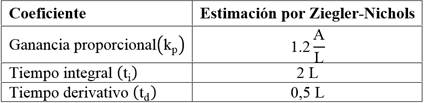 [12]La sintonización de cada uno de los controladores se realizó con la aplicación del primer método de Ziegler Nichols, usando la metodología de y estimando cada coeficiente como se muestra en la tabla 3. El tiempo de retardo del sistema L y la constante de tiempo A se deducen experimentalmente, para una respuesta subamortiguada con un tiempo de estabilización por debajo de 500 ms.