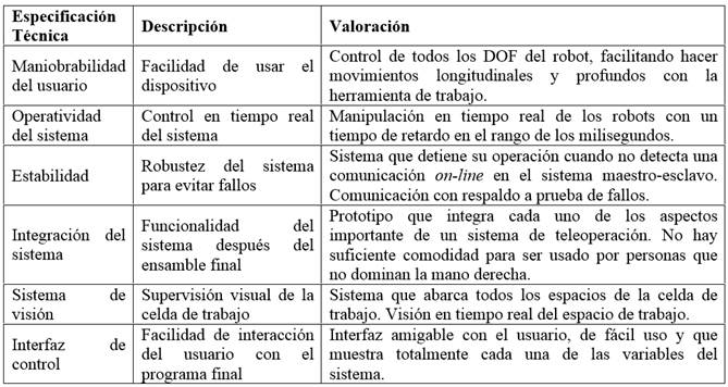 En la primera parte de las pruebas, se evaluaron las especificaciones técnicas del sistema teleoperado por parte de cada uno de los operarios. Cada uno de ellos mostró su punto de vista respecto a la maniobrabilidad por parte del usuario, el sistema de visión, la operatividad del sistema, entre otros. Los resultados de dichas pruebas son mostrados en la tabla 4, compactando los comentarios de cada uno en una sola valoración.