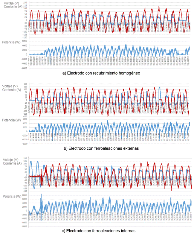 Se reconocen diferencias entre el comportamiento eléctrico de los electrodos con recubrimiento homogéneo y los que poseen las ferroaleaciones ubicadas interna o externamente respecto a la matriz. Estas diferencias radican en la diferenciación de los parámetros eléctricos fundamentales del proceso, tales como el voltaje y la corriente.