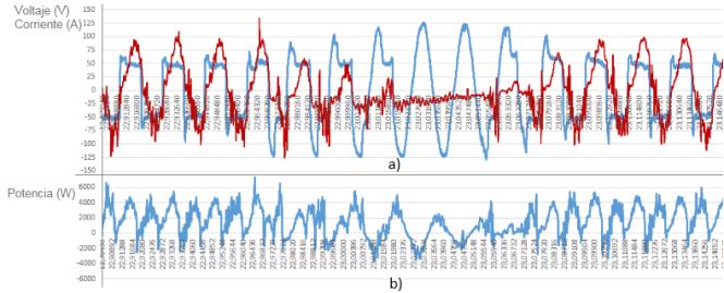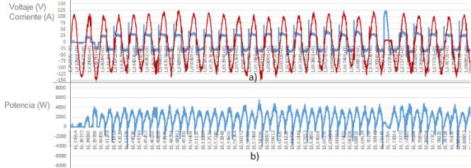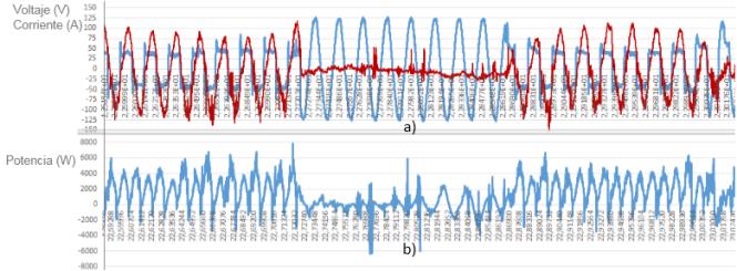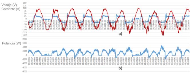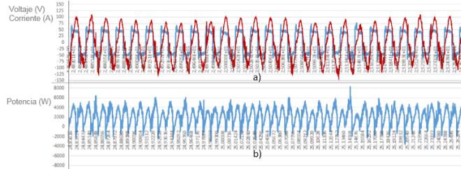 La curva de potencia (ver Fig. 1b) muestra, también, valores sistemáticos de desfasaje entre las ondas de corriente y voltaje.