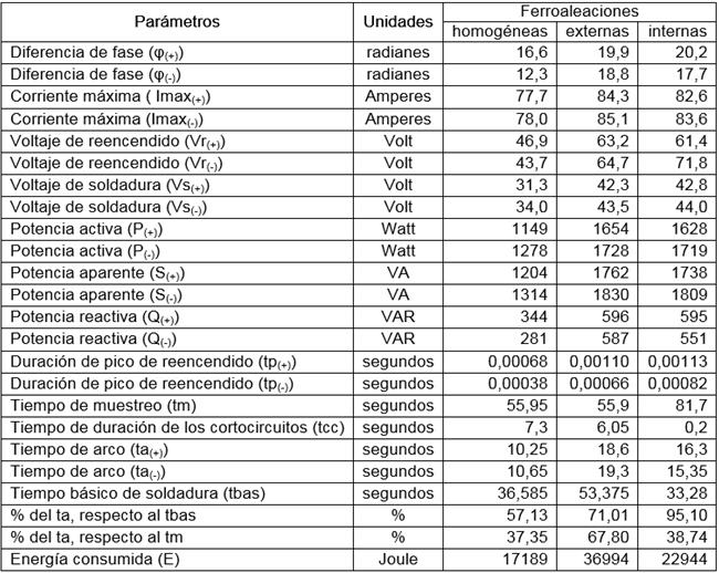 Aunque la energía consumida está directamente relacionada con la potencia, para su determinación es preciso afectar la potencia por el tiempo en que transcurre el proceso. De esta forma, sigue siendo el electrodo con recubrimiento homogéneo el que menos energía consume (17189 W-s); sin embargo, el de ferroaleaciones internas logra disminuirla considerablemente, también a costa de una disminución del tiempo de realización del proceso. Estos aspectos no habían sido anteriormente reportados por González en trabajo similar 5.