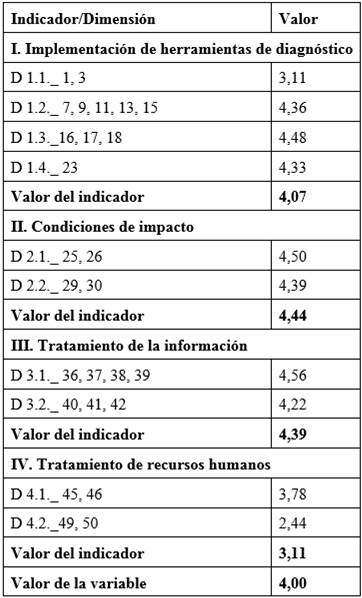 En la tabla 3 se muestran los resultados de la recogida y evaluación de la encuesta en función de las respuestas de los 9 expertos consultados en la empresa que se escogió como campo de investigación. También se exponen los resultados de todos los indicadores y dimensiones que fueron evaluados