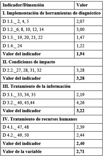En esta variable el valor total para la empresa objeto de estudio es de 2,71 cercano al regular pero declarado de malo, mostrando que la misma no está preparada para la implementación en este momento de una filosofía de RCM. El resultado negativo en esta variable está influenciado principalmente por los indicadores implementación de herramientas de diagnóstico y tratamiento de recursos humanos, aunque de forma general todos los demás tienen evaluaciones de regular. Para poder implementar un RCM se debe trazar un programa para la mitigación de los problemas detectados para dar paso a la obtención de resultados que validen esta posibilidad.