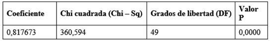 De la tabla anterior se obtiene un coeficiente de concordancia de 0,82 aproximadamente, lo que se considera alto. Para la determinación de la significación de dicho coeficiente se utiliza la siguiente prueba de hipótesis: