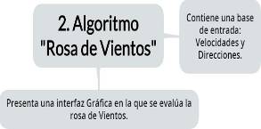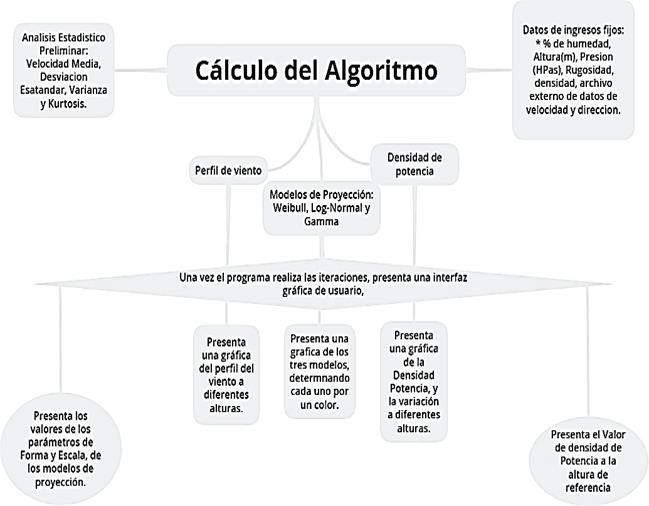 El algoritmo comprende todo un análisis estadístico inferencial como base para la solución de los modelos paramétricos de distribución, el perfil del viento, la densidad de potencia eólica y su variación con respecto a la altura y la rosa de vientos, figura 2 .
