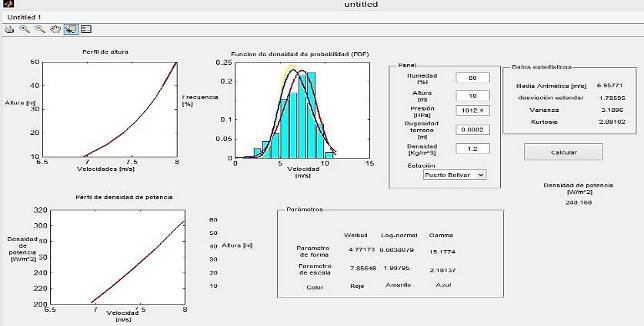 Una vez definidos los datos de entrada al sistema se ejecuta el algoritmo obteniendo una interfaz gráfica en la que se observa el análisis estadístico inferencial, la gráfica del perfil del viento a varias alturas, la gráfica de perfil de potencia, las gráficas relacionadas con cada uno de los matemáticos de proyección, por ultimo muestra una tabla de los parámetros de cada modelo y la densidad de potencia eólica, visto el resultado en la figura 4 para la Estación de Puerto Bolívar, ídem para Usme. Con este resultado se puede determinar el comportamiento del viento para cada estación.